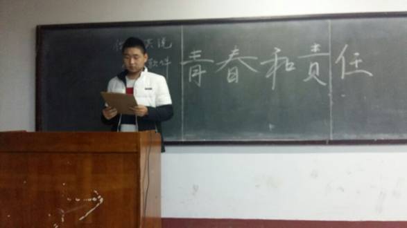 蔺鑫亮同学将一篇名为“青春更是一种责任”在活动现场带给了同学们,生命对每个人只有一次,而青春则是这仅有的一次生命中易逝的一段。我坚信:流星虽然短暂,但在它划过夜空的那一刹那,已经点燃了最美的青春。让我们肩负起历史的使命,让身体里流淌的血液迸发出激情!让我们都做夜空下那颗闪亮的星星!当讲到这句话时, 我们都哽咽了,生命只有一次,而我们却在随他流逝。