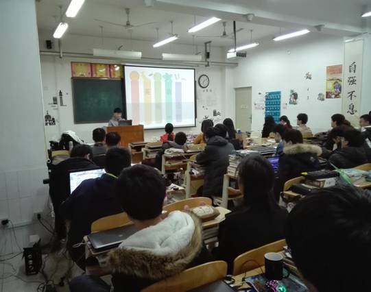 本次班会由团支书张晓举行,班会分为两个环节。首先是围绕“如何正确看待大学英语学习”进行分小组讨论,由代表总结发言。 第二部分是班内英语学习优秀同学齐腾上台讲述了自己英语学习的经验。