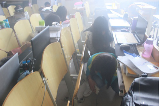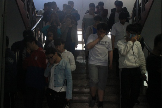 5.12日下午,我们举行了防震防火演练,目的是让我们学会逃生本领。第一声哨想起我们抱头并躲在桌子下面进行避震,这时候打开教室的所有门。三分钟后第二声哨想起同学们快速而有秩序的跑下楼梯进行疏散做到不拥不挤。然后我们就到学校的后边学习灭火器的种类和灭火器的使用方法。