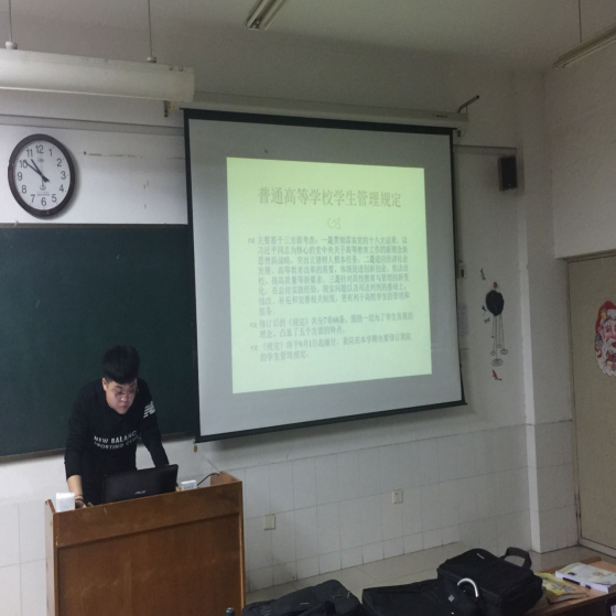 2017年2月23日星期四晚自习由班长和团支书带领全班在教室开展了《普通高等学校学生管理规定》主题班会。
