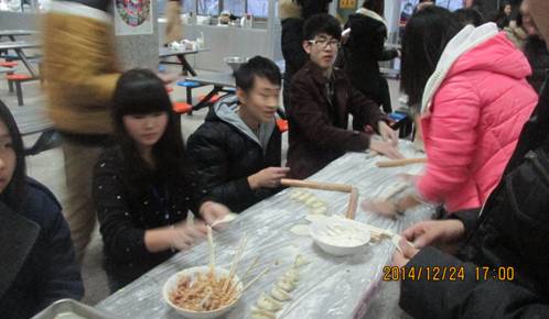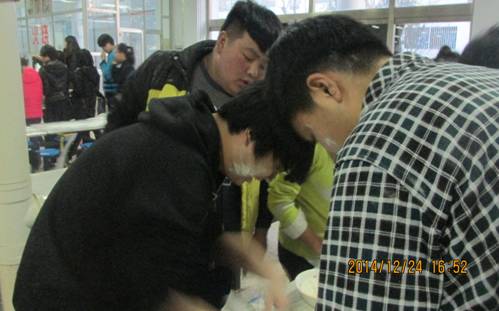 年少的我们,还是会因为这种活动而兴奋,至少就我自己来说还是第一次在学校这样庆祝元旦,我想大多数同学在家里包饺子的机会应该不多,当今天我们可以自己做主包一次饺子的时候还是相当兴奋的!一边说着,对自己的“作品”评价着,一边因为一些小失误、闹的小笑话笑着,一边乐此不疲的在别人脸上抹面粉,这些看似幼稚的行为,在这个下午看上去却是那么纯真,那么令人怀念那个不会再回来的小时候!