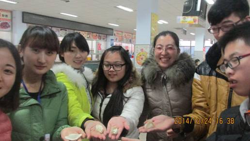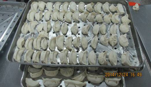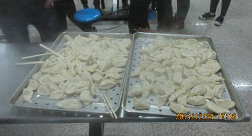 看着自己辛辛苦苦一下午的结果,虽然累,但还是觉得很满足,两大盘饺子,就在同学们的欢声笑语中被吃光了,不得不说的是味道真的不错!