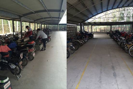 保持车棚里车子有序排放的同时,我班同学还清理了车棚地面的垃圾,并把聚集于此的落叶清理干净。