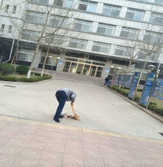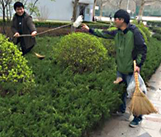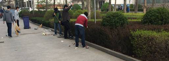 办公楼前的花坛是我校卫生一大顽疾,里面经年聚集着大量白色垃圾,由于有的垃圾藏身于花坛深处,同学们操起了长杆把垃圾一一挑出。